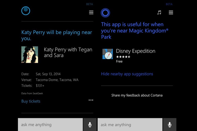 - کورتنا همچنین اتفاقات هنری روی داده در فاصلهی ۱۰۰ مایلی از کاربر را که میتواند شامل کنسرتهای خوانندگان مورد علاقهی کاربر باشد، نمایش داده و کاربر را مطلع خواهد کرد. کورتنا نحوهی علاقمندی کاربر به یک هنرمند خاص را از طریق جستجوهای انجام شده توسط کاربر روی تلفنهوشمند، پیسی مجهز به ویندوز ۸ یا سرویس بینگ متوجه میشود. کورتنا از این پس قادر است تا براساس موقعیت مکانی کاربر اپلیکیشنهای مرتبط و مناسب با محل را نیز به کاربر پیشنهاد دهد. برای مثال در صورتی که در یک موزه باشید، کورتانا اپلیکیشن اختصاصی موزه را برای دریافت اطلاعات بیشتر به شما پیشنهاد می کند.